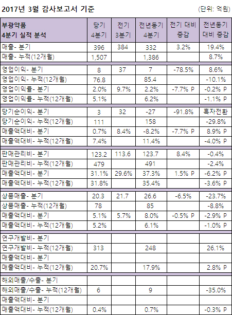부문별로 4분기 매출은 전기비 12억 증가, 전년비 64억 증가(+19.4%, 자사 제품 71억 증가)했고, 누적 매출은 전년비 121억 증가(+8.7%, 자사 제품 129억 증가)했다.