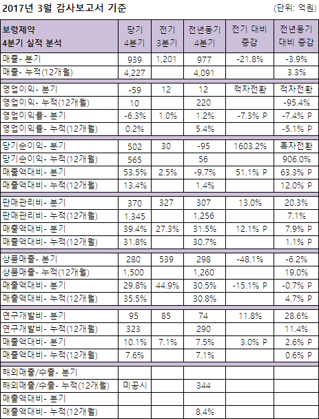 보령제약은 3월 감사보고서 기준 지난해 4,227억원의 매출을 달성, 전년동기대비 3.3% 성장했다.
