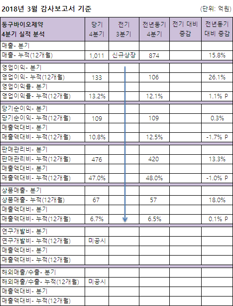 동구바이오제약(신규 상장)은 3월 감사보고서 기준 지난해 1,011억원의 매출을 달성, 전년동기대비 15.8% 성장했다.