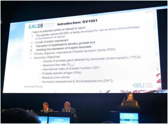 유럽비뇨기과학회 공식 학술지인 European Urology 편집자이며 루트비히 막시밀리안 뮌헨 대학교 크리스티안 그라츠 교수는 연구 발표 후 “ GV1001은 전혀 새로운 기전의 약물이며 연구 결과가 매우 고무적이다. 향후 3상 임상 시험을 성공적으로 끝내고 꼭 그 결과를 EAU에서 다시 발표하기를 바란다”고 말했다.