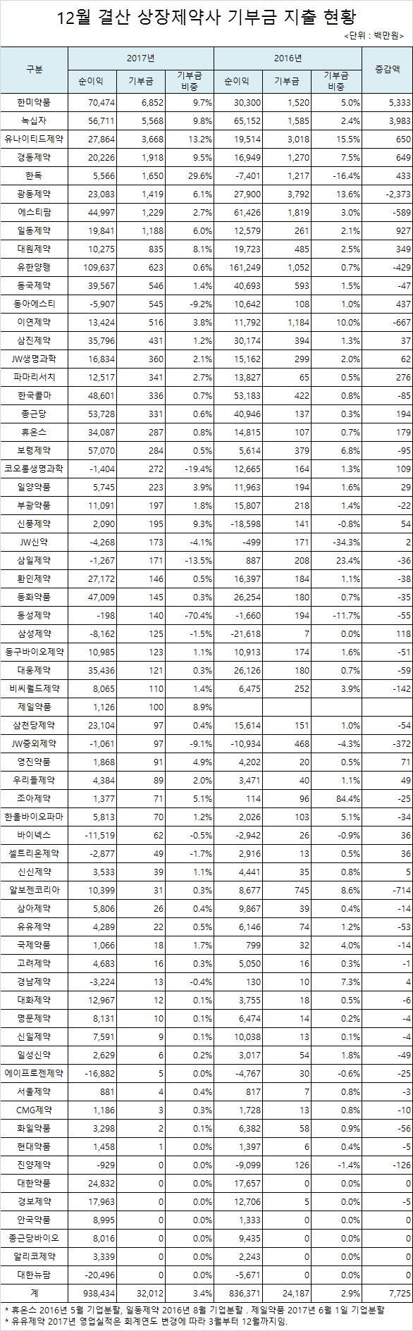 2016년 비교해 지난해 기부금 지출액을 가장 많이 늘린 곳은 한미약품으로 53억 3,300만원이 증가했고, 녹십자 39억 8,300만원, 일동제약 9억 2,700만원, 유나이티드제약 6억 5,00만원, 경동제약 6억 4,900만원 등의 순이었다.