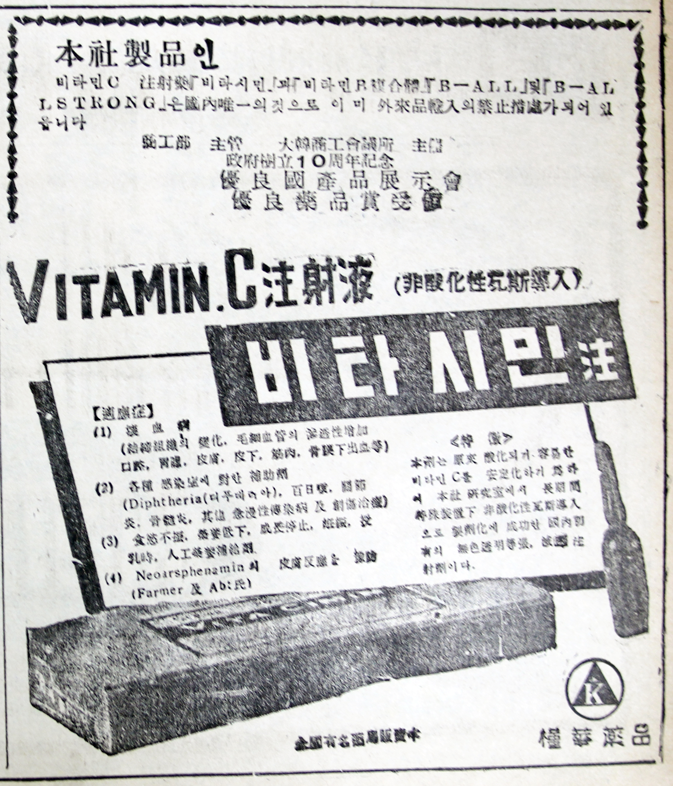 근화약품 비타시민 주 광고.  비타민C 주사액 제품인 비타시민은 당시로서는 드물게 공급되던 비타민 주사제로 정부수립 10주년을 기념해 개최된 국산우량품전시회에서 우량약품상을 수상한 제품임을 전면에 내세워 강조하고 있다.