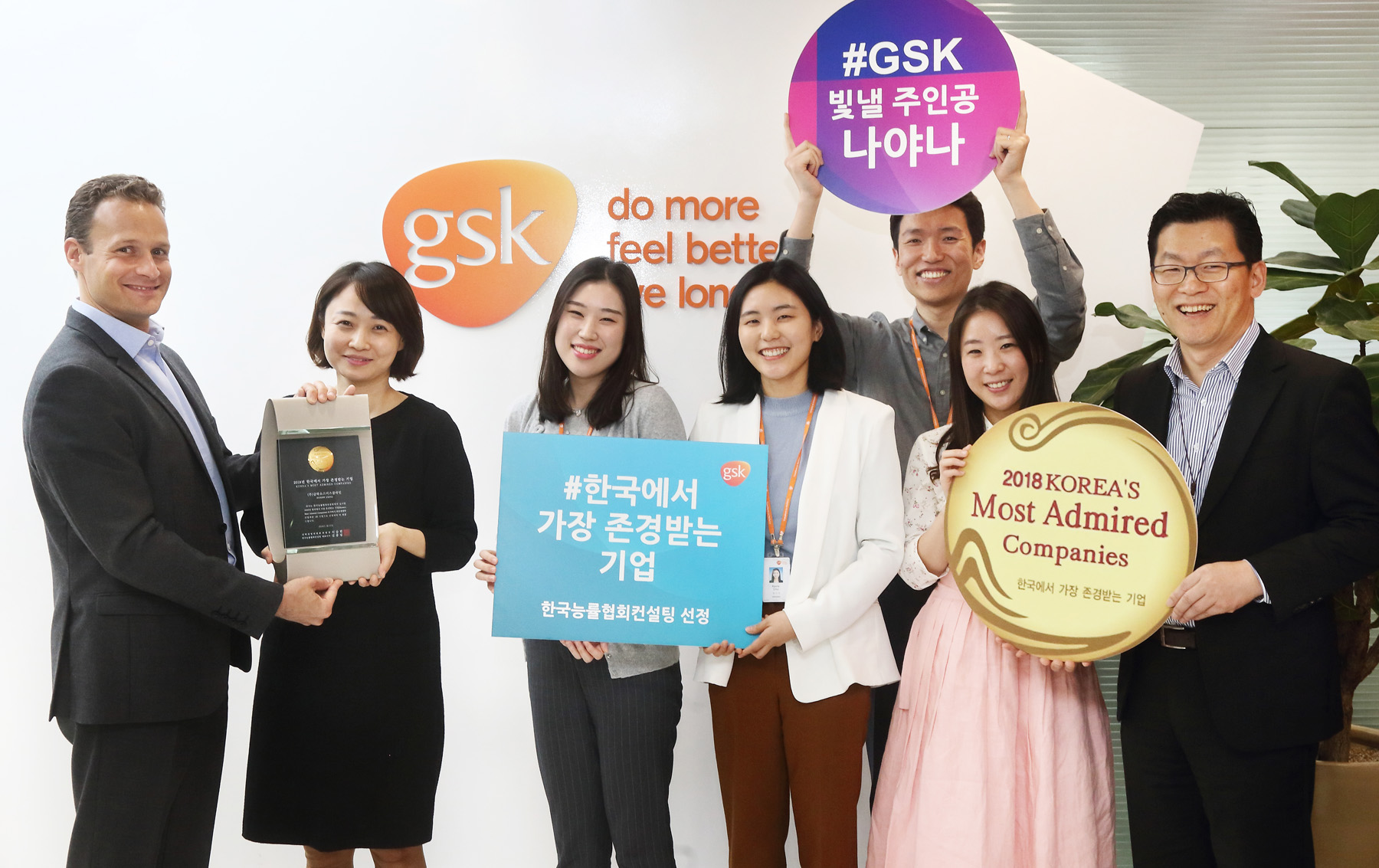 GSK 한국법인(줄리엔 샘슨 사장)은 한국능률협회컨설팅(KMAC: 김종립 대표이사)이 주관한 ‘2018 한국에서 가장 존경받는 기업’ 조사에서 외국계제약 산업부문 1위 선정을 기념하여 9일, 임직원들이 참석한 가운데 한국능률협회컨설팅이 수여하는 인증패 전달식을 가졌다.