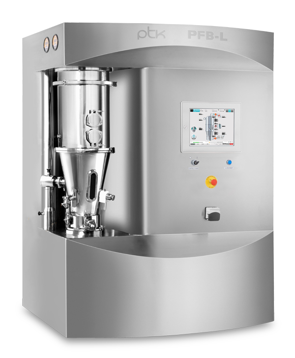 PTK의 PFB Series는 실험용부터 생산용 대용량까지 모든 모델이 구비돼 있으며, 건조(Drying), 입자 생성(Granulating), 입자 코팅(Coating)이 가능하다. Container 등 각각의 연결 부분에는 Inflatable seal을 사용함으로써 밀폐 능력을 향상 시켰고 Servo motor에 의한 Wire를 이용, Filter housing을 하강시켜 필터를 쉽고 빠르게 교체할 수 있다.