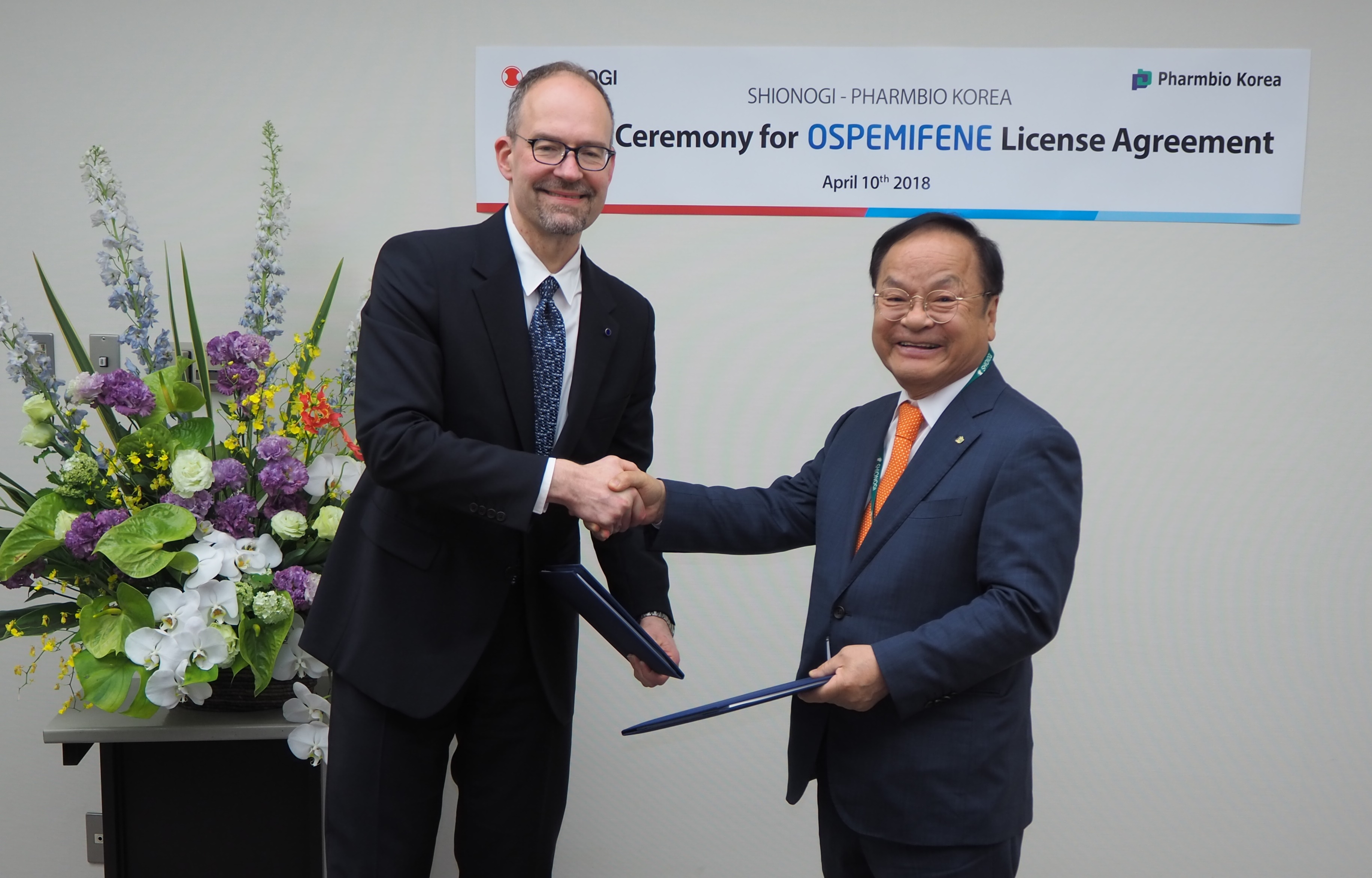 한국팜비오(회장: 남봉길)는 일본 다국적제약사 시오노기 (Shionogi, 오사카, 대표이사 : 이사오 테시로기)사가 개발한 폐경기 여성의 외음부 및 질 위축증 치료제 오스페나(성분명: Ospemifene) 국내 독점 공급을 위한 라이선스 계약을 체결했다고 18일 밝혔다.