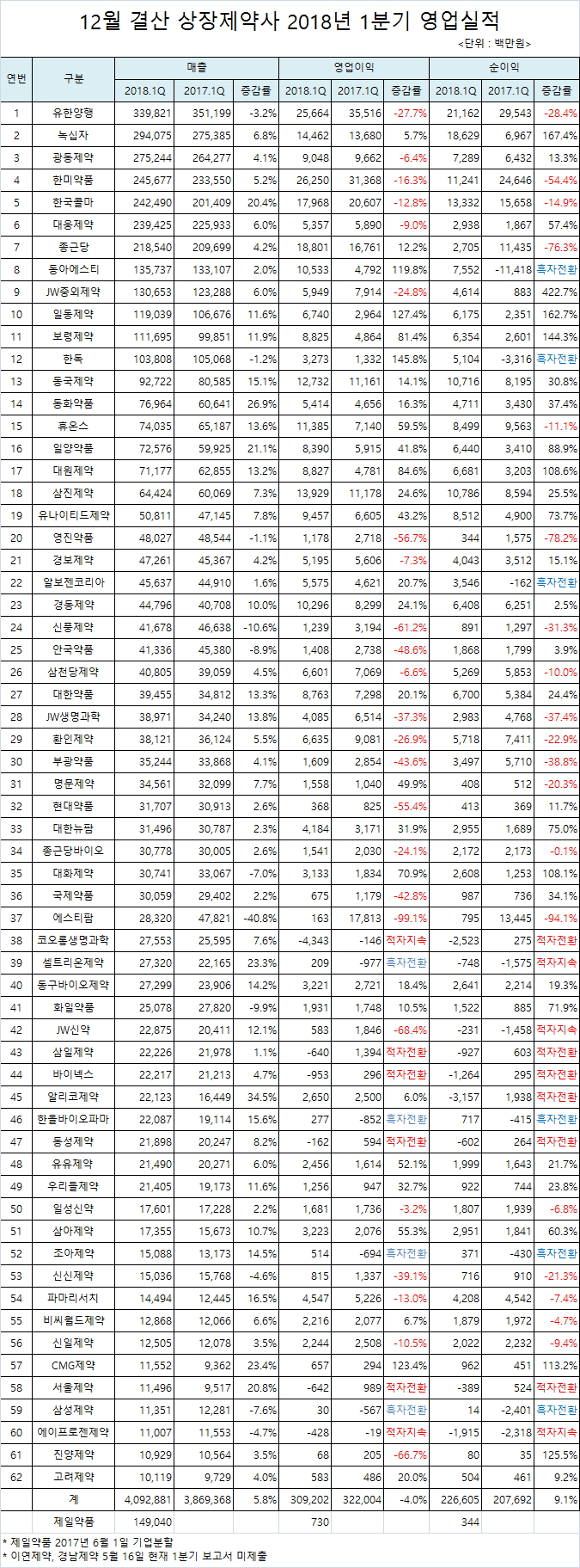 약업닷컴(www.yakup.com)이 코스피 및 코스닥 상장 제약사들이 제출한 2018년 1분기 보고서를 분석한 결과, 조사대상 제약사들은 매출은 평균 5.8% 성장했고, 영업이익은 4% 감소한 것으로 집계됐다. 영업외 수익의 증가로 인해 순이익은 9.1% 늘어났다.<지주회사 및 바이오 제약사 제외>