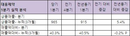 대웅제약은 1분기 전년동기대비 5.4% 증가한 965억원의 상품매출을 기록했다. 증가에는 넥시움(29억 증가) 세비카(17억 증가) 등이 작용했다
