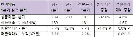 한미약품은 상품매출 부문에서 유한양행과 GC녹십자보다 양호한 실적을 보였다. 1분기 상품매출이 전년동기대비 4.6% 증가(8억)했지만 189억원에 불과했고, 매출대비 비중도 7.7%로 10%를 넘지 않았다. 매출비 비중은 전년비 변동이 없었다.