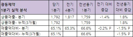 한편 지난해 전체 매출 3위를 차지한 광동제약은 올해 1분기 전년동기대비 1.8% 증가(32억 증가)한 1,792억원의 상품매출액을 기록했다.