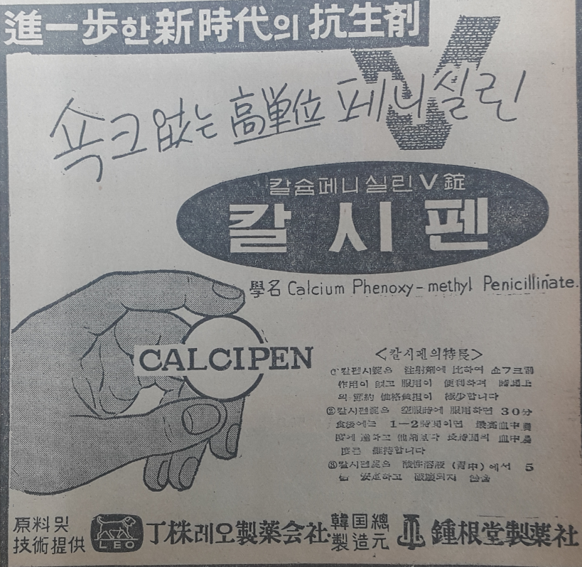 종근당 칼시펜 광고. 레오제약으로부터 원료 및 기술을 제공받아 종근당이 국내생산을 시작한 항생제 칼시펜의 60년대 초반 광고내용이다. "진일보한 신세대 항생제. 쇼크없는 고단위 페니실린" 이란 카피가 눈에 띈다.