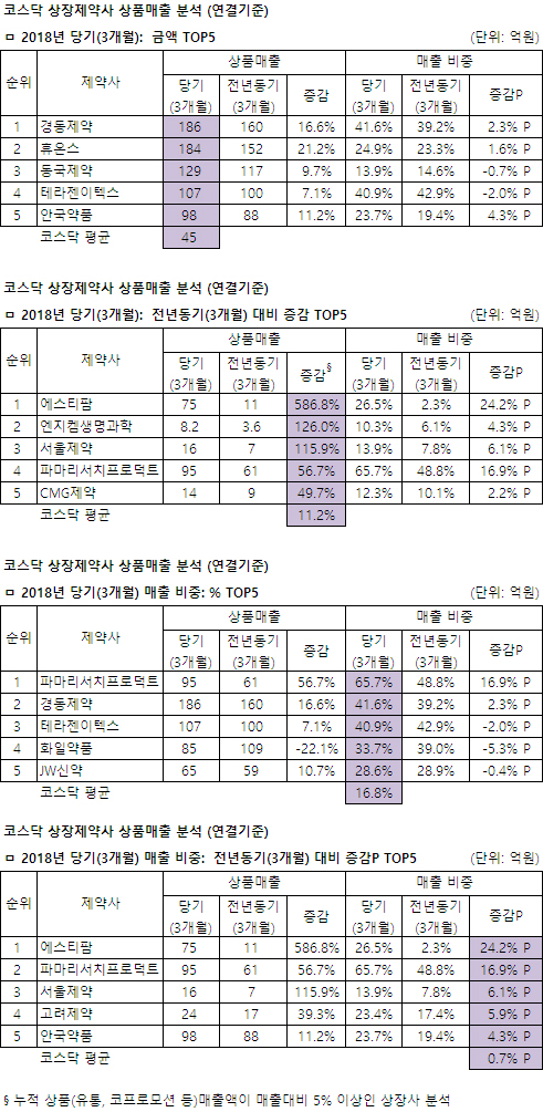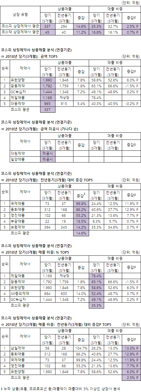 상품매출액이 가장 많은 제약사는 코스피는 유한양행 코스닥은 경동제약, 전년동기대비 증감률이 가장 높은 제약사는 코스피는 국제약품 코스닥은 에스티팜, 매출액대비 비중이 가장 높은 제약사는 코스피는 제일약품 코스닥은 파마리서치프로덕트로 나타났다.