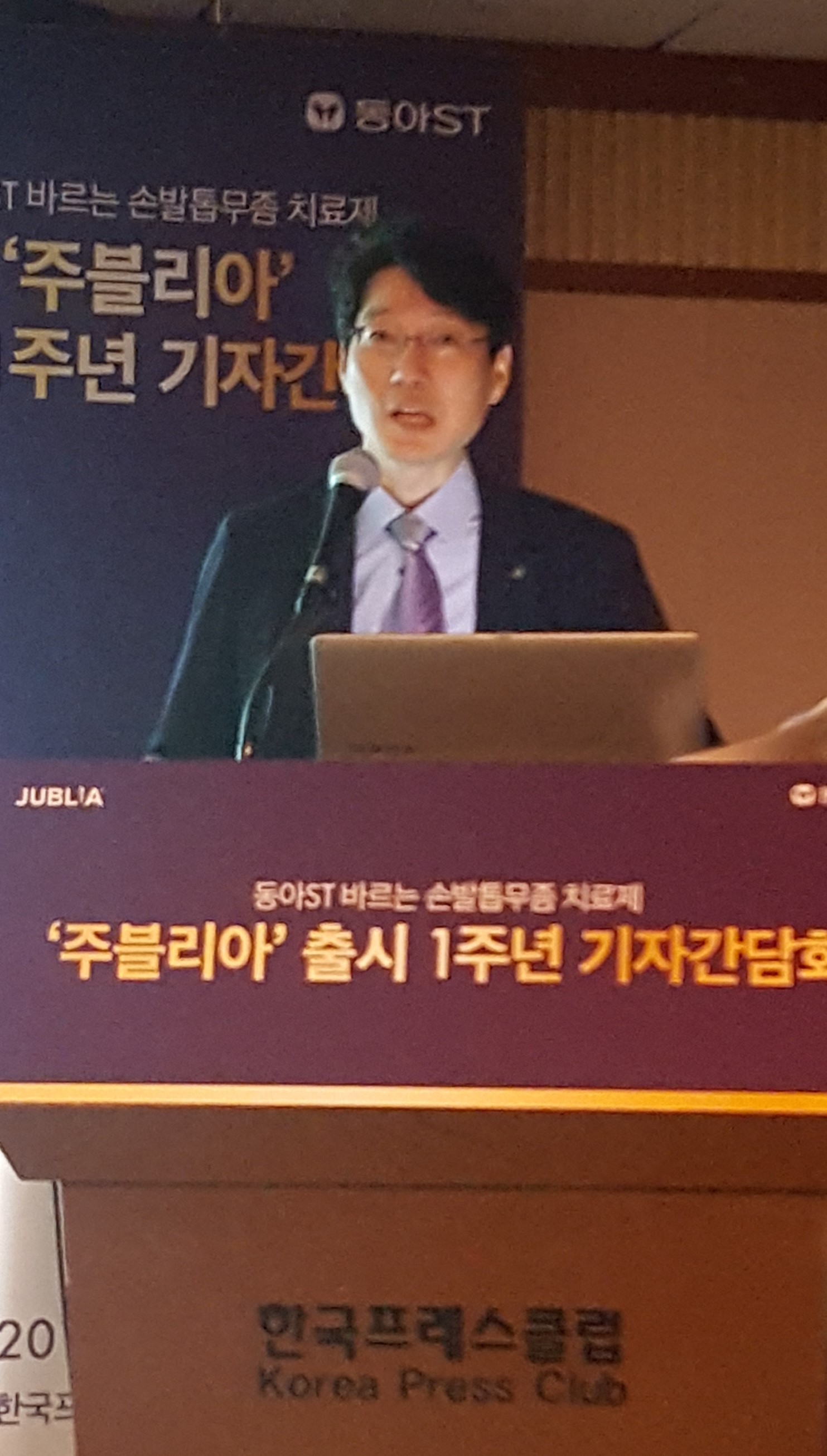 19일 프레스센터에서 열린 ‘주블리아 출시 1주년 기자간담회’에서 경북대학교병원 피부과 이원주 교수는 “여기서 바르는 약에 대한 수요가 생겨난다. 특히 손발톱은 일반 피부 대비 수분은 10~25%, 지방은 1%에 불과하다. 그만큼 윗부분은 딱딱하지만 아래 부분은 부드러워 균이 훨씬 더 잘 침범할 수 있는 구조를 가지고 있다”고 설명했다.