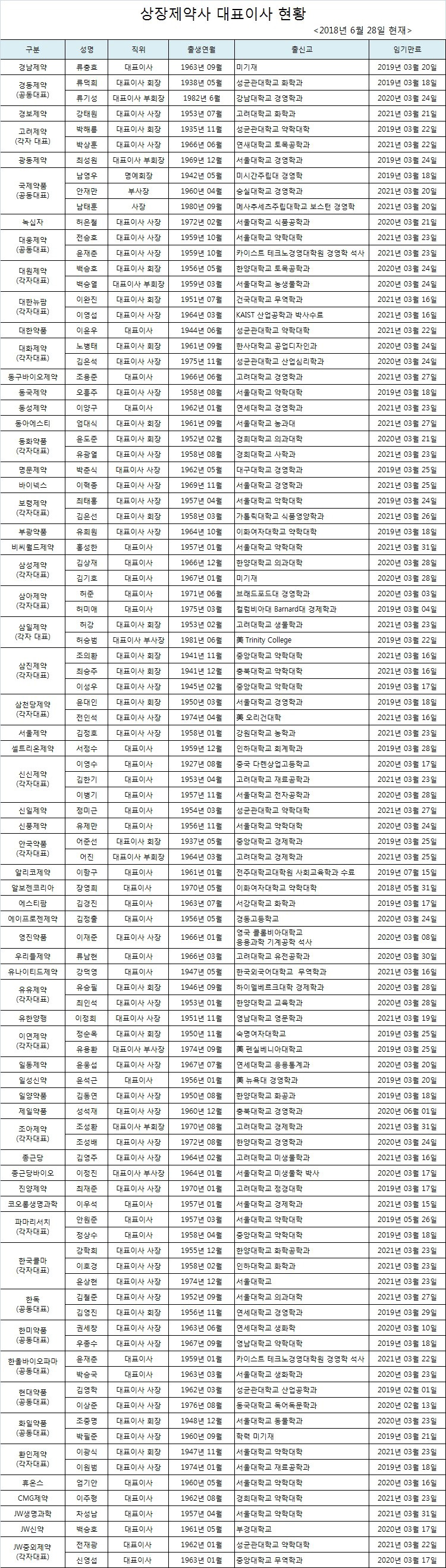 상장제약사 대표이사 5명중 2명은 서울대, 고려대, 연세대 등 이른바 SKY 출신으로 파악됐다. 또 대표이사 5명중 1명은 악사출신인 것으로 조사됐다. .