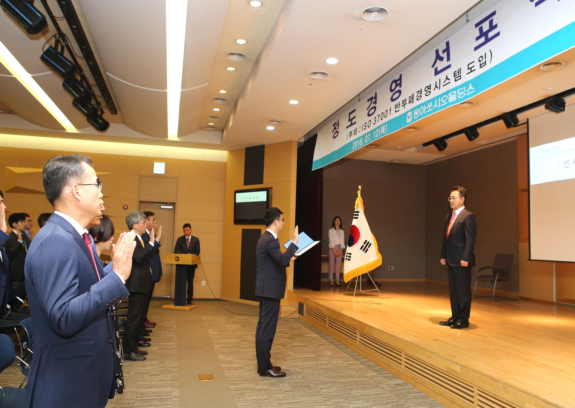 정도경영 선포식은 구성원 모두가 ‘정도, 성실, 배려’의 동아쏘시오그룹 창업정신을 되새기고, 그룹의 경영 투명성 및 국내외 신인도 제고와 기업의 사회적 책임을 다하기 위한 정도경영 실천을 다짐하고자 마련됐다.