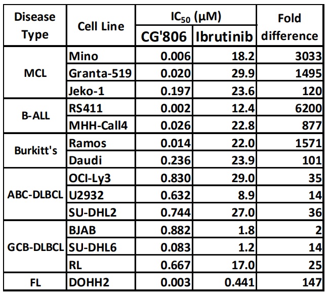 이번 유럽혈액학회에서 발표된 내용은 BTK 표적과 관련된 악성 B 세포 종양 전반에서 CG-806이 임브루비카에 비교해 우월성과 차별성을 보여줬다고 회사 측은 설명했다.