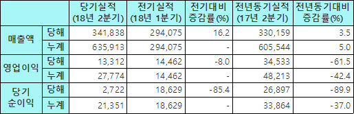 영업이익은 277억7,400여만원으로 전년동기(482억1,300여만원) 대비 42.4%, 순이익은 213억5,100여만원으로 전년동기(338억6,400여만원) 대비 37.0% 각각 감소했다.
