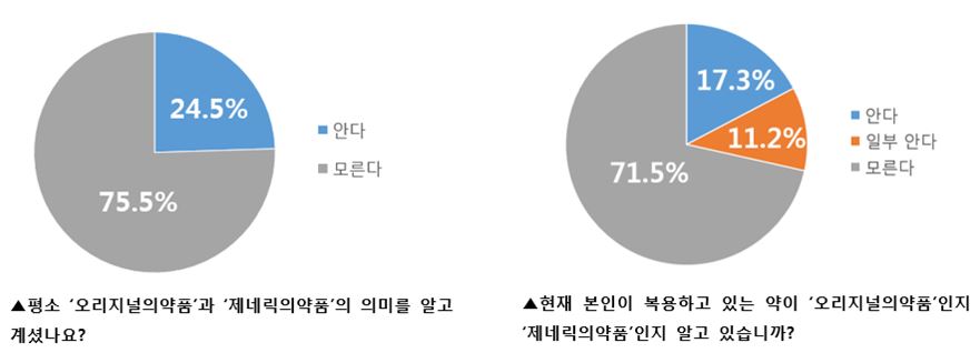환자 4명 중 3명 꼴로 ’오리지널의약품’과 ‘제네릭의약품’의 의미와 현재 본인이 복용하고 있는 약이 어떤 쪽에 속하는지 인지하고 있지 못했다.