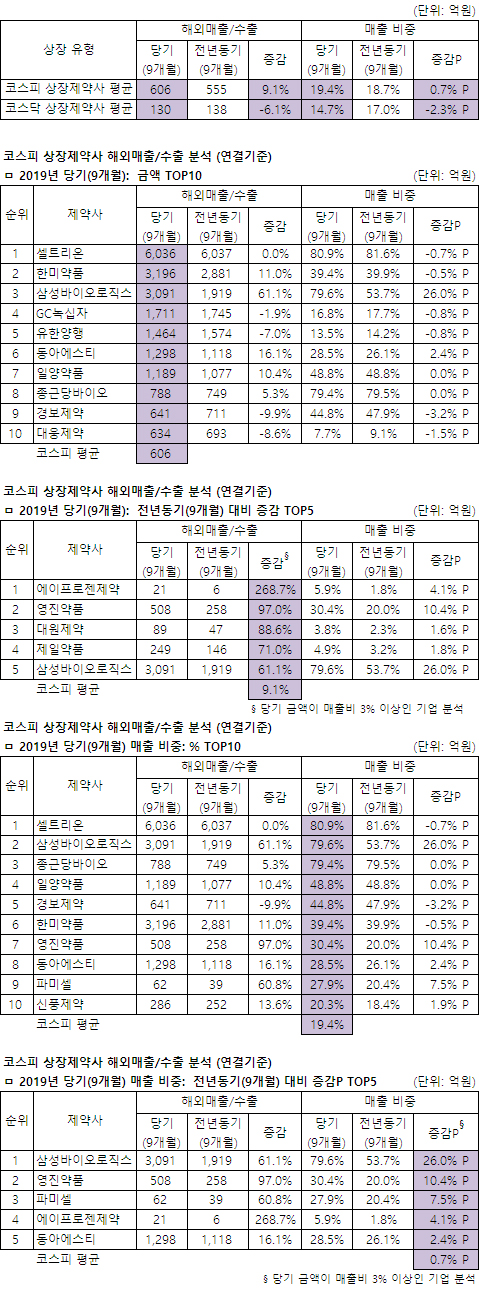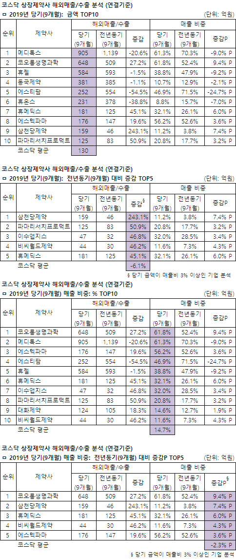 전년동기대비 증감률은 에이프로젠제약이 268.7%로 가장 높았고 영진약품이 90%, 대원제약이 80%, 제일약품이 70%를 넘었다. 해외매출/수출 '톱10'중 삼성바이오로직스만 '톱5'에 들었다(평균 9.1%)