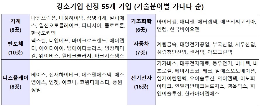 이번 55개 기업은 분야별로 기초화학(6곳), 자동차(7곳), 기계(8곳), 디스플레이(8곳), 전기전자(16곳)에서 각각 선정됐다.