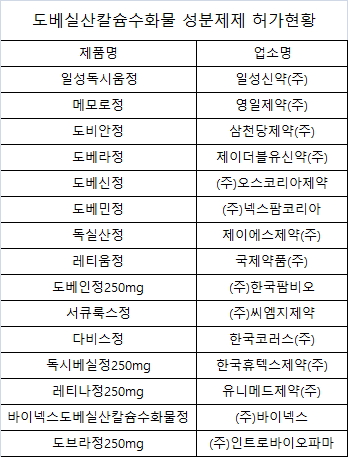 도베실산칼슘수화물의 일성신약의 '일성독시움정' 등 14품몰이 허가돼 있다.