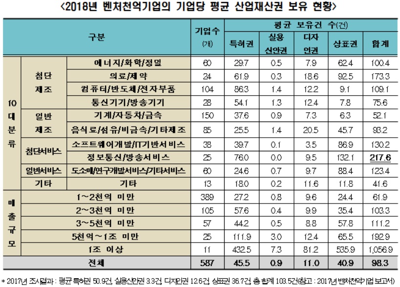 그러나 특허권, 상표권 등 '산업재산권'은 의료/제약 벤처천억기업이 평균보다 높은 수준으로 보유하고 있었다.