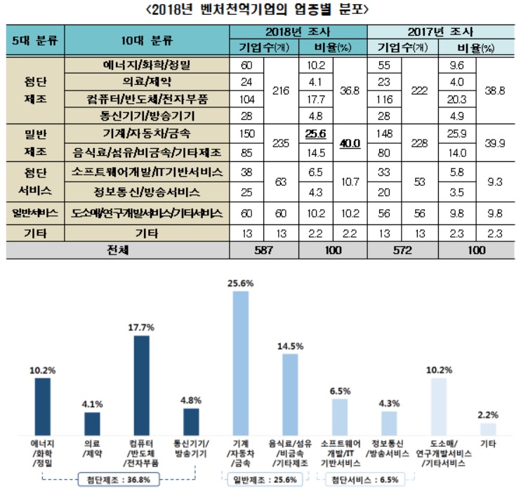 2018년 벤처천억기업은 587개사로, 전년보다 2.6% 증가(15곳)했다. 이중 최초로 1천억 매출을 달성해 신규진입한 기업은 58개사이며, 가젤형 벤처천억기업(3년 연속 20% 이상 매출이 증가)은 28개사였다.