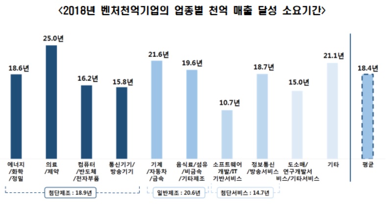 전체 벤처천억기업의 창업 이후 천억 매출달성까지 소요기간은 18.4년으로 조사됐다.