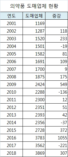 2001년부터 2017년까지 의약품 도매업체가 전년도보다 줄어든 해는 2004년, 2010년, 2014년, 2017년 단 4차례에 불과했다