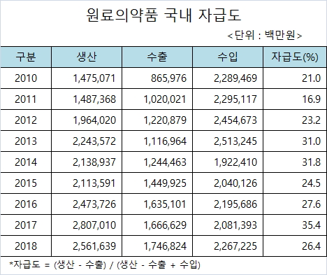 연도별 원료의약품 자급도는 2010년 21.0%, 2011년 16.9%, 2012년 23.2%, 2013년 31.0%, 2014년 31.8%, 2015년 24.5%, 2016년 27.6%, 2017년 35.5%, 2018년 26.4% 였다.