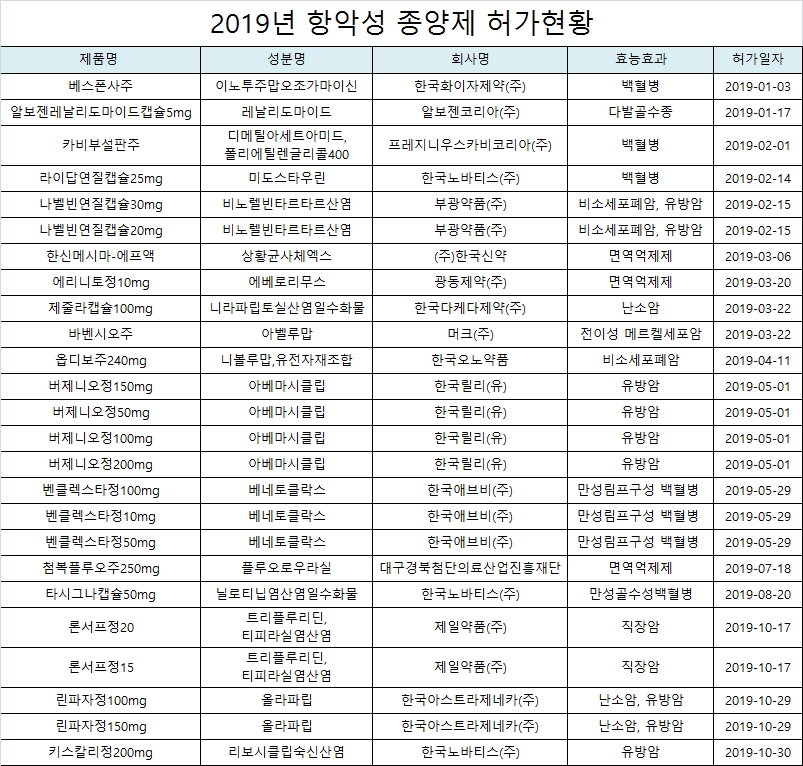 백혈병치료제는 베스폰사주, 카비부설판주, 라이답연질캡슐25mg, 벤클렉스타정100mg, 벤클렉스타정10mg, 벤클렉스타정50mg, 타시그나캡슐50mg등이 허가를 받았다.