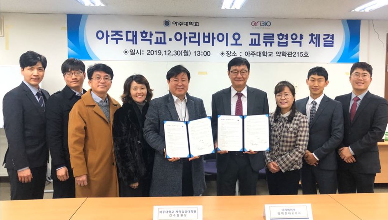 아리바이오 (대표이사: 정재준)와 아주대학교 글로벌제약임상대학원 (원장: 김수동)은 신약개발 공동 연구를 포함한 전략적 협력관계를 구축하는 업무협약을 체결했다고 30일 밝혔다.