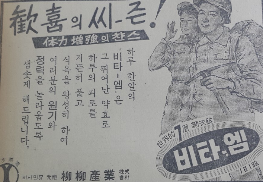 유유산업 비타엠 광고.  비타엠은 유유산업(현재의 유유제약)이 1957년에 발매한 국내최초의 종합비타민 제품으로 잘 알려져 있다.  유유산업은 1941년 설립이후 현재까지 70년 이상의 장구한 역사를 이어오며 특히 1965년 국내최초의 연질캡슐 활성비타민 비나폴로를 개발 시판에 나서는 등 종합비타민 시장의 선두주자로 자리매김 해오고 있다.