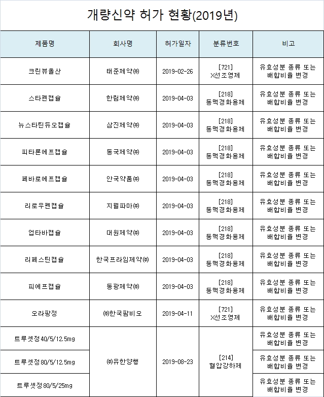 식품의약품안전처는 지난해 1월 31일 태준제약의 '크린부올산'을 시작으로 8월 23일 유한양행의 '트루셋정'까지 개량신약으로 허가한 이후 11월 12일 현재 4개성분 13개 품목을 개량신약으로 허가했다.