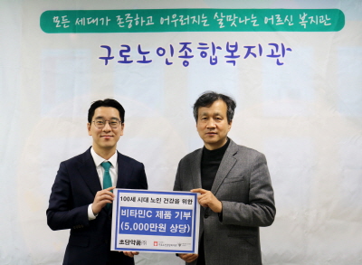 초당약품(주)은 지난 9일 100세 시대 건강하고 아름다운 노후를 위한 건강 동반자로 구로노인복지관에 비타민C 8만 3천포(소비자가 5천만 원 상당)를 기부하며, 사회공헌활동에 시동을 걸었다.