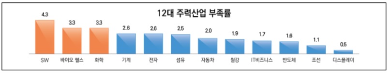 최근 5년 동안 12대 주력산업별 부족률은 0.2%p 범위 내에서 안정적 변화를 유지하고 있는데, 바이오헬스와 SW, 화학산업의 부족률은 타 주력산업보다 지속적으로 높은 수준이었다.