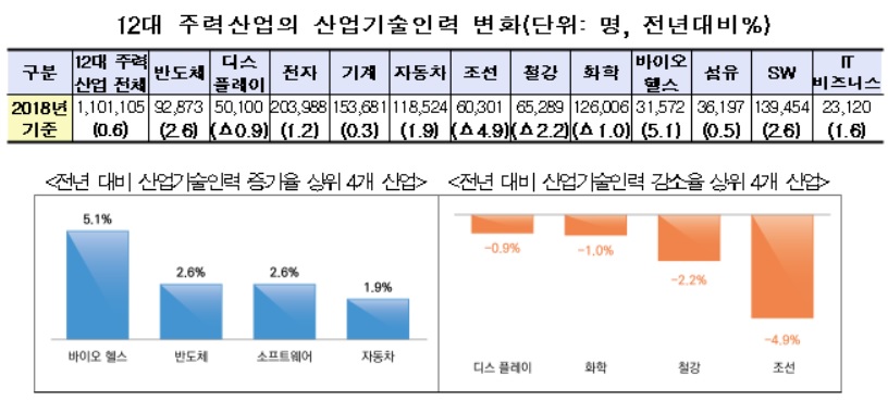 그중 12대 주력 산업의 산업기술인력은 110만 1천명으로 전년대비 0.6% 증가했다. 4개 분야는 인력이 감소한 반면, 8개 분야 인력은 증가했다.
