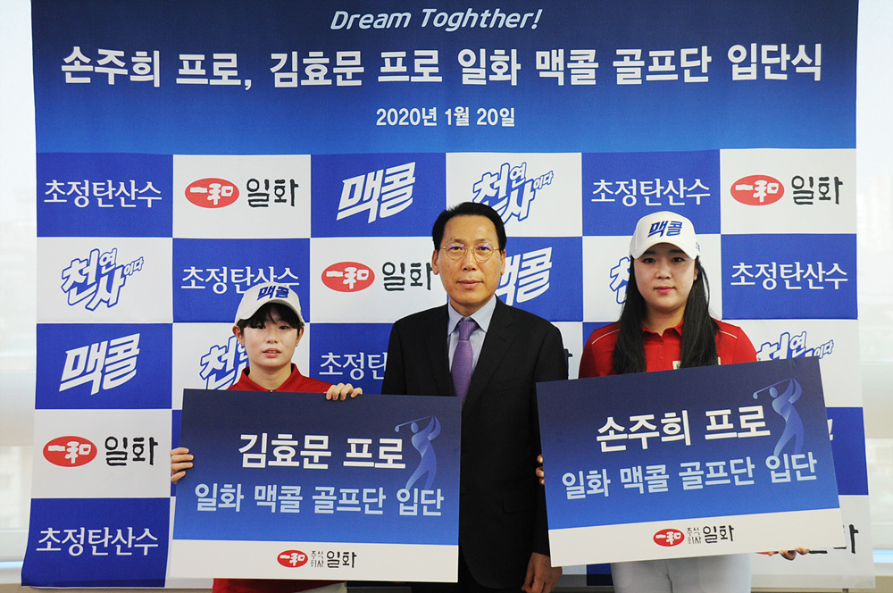 ㈜일화(대표 정창주)가 2020년 KLPGA 시즌을 맞아 일화 맥콜 골프단에 신규 프로골퍼 2명을 영입하고 입단식을 진행했다고 20일 밝혔다. 이번에 일화에서 영입한 프로 선수는 KLPGA 김효문 프로와 손주희 프로 2명이다.