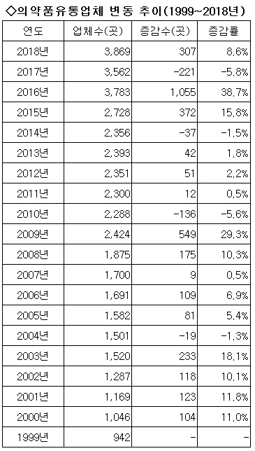 식품의약품안전처의 ‘2019 식품의약품 통계연보’에 따르면 의약품도매업체 수는 1999년 942개소에서 창고 면적이 자유화된 2000년 1,046곳을 시작으로, 2001년 1,169곳, 2002년 1,287곳, 2003년 1,520곳 등으로 지속적으로 증가했으며, 2009년에는 2,424곳을 기록하며 처음으로 2천 곳을 넘어섰다. 이후 2015년 2,728곳, 2016년 3,783곳, 2017년 3,562곳, 2018년 3,869곳으로 4천곳에 육박했다.