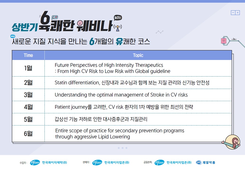 ‘새로운 지질 지식을 만나는 6개월의 유쾌한 코스, 육(6)쾌한 웨비나’라는 타이틀로 상반기 동안 진행될 여섯 가지 강연 주제가 공개된 가운데, ‘리피토 웨비나’의 시작을 알리는 첫 번째 강연은 1월 29일 오후 1시부터 2시까지 고려의대 심장내과 홍순준 교수가 ‘고강도 요법에 대한 전망: 글로벌 치료 지침과 함께 심혈관계 고위험에서 저위험군까지(Future Perspectives of High Intensity Therapeutics: From High CV Risk to Low Risk with Global guideline)’를 주제로 진행한다.