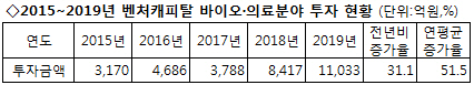 특히 벤처캐피탈업체들의 바이오·의료 분야 투자는 2015년 3,170억원에서 2016년 4,686억원으로 증가했다가 2017년 3,788억원으로 감소했지만 2018년 8,417억원으로 전년 대비 2배 이상 급증한 이후 2019년 1조1,033억원으로 빠르게 성장하며 이 기간 동안 51.5%의 높은 연평균 성장률을 기록했다.