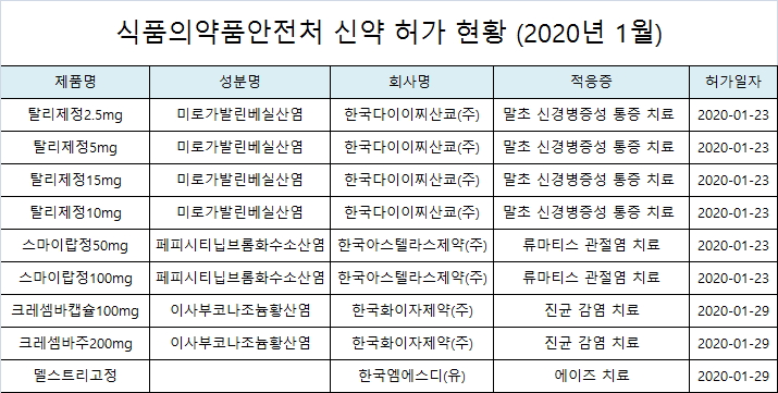 식품의약품안전처는 지난 1월 한국다이이찌산쿄의 말초 신경병증성 통증 치료제 '탈리제정2.5mg' 등 4품목, 한국아스텔라스제약의 류마티스 관절염 치료제 '스마이랍정50mg' 등 2품목, 한국엠에스디의 에이즈 치료제 '델스트리고정', 한국화이자의 진균 감염 치료제 '크레셈바캡슐100mg' 등 2품목 총 4개 성분 9개 품목을 신약으로 허가했다.