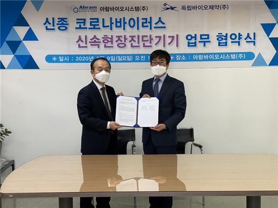 분자진단 전문 기업 아람바이오시스템(대표 황현진)과 신약개발 및 의료IT 전문 제약사 독립바이오제약(대표 정태기)은 신종 코로나바이러스 진단시스템 ‘2019-nCoV Fast POCT System (FPS)’(가칭) 승인 및 생산, 판매 업무협력을 위한 양해각서(MOU)를 9일 체결했다.