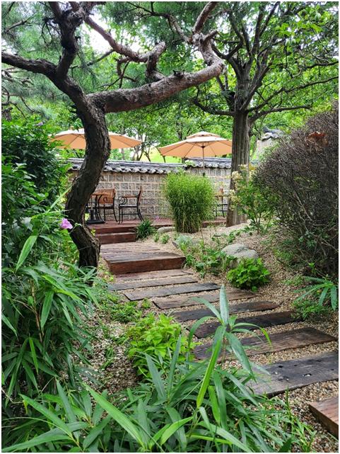 야외 정원은 본사 사옥 전반적 느낌과 어울리는 모던하고 도시적인 느낌의 정원 콘셉으로 산책을 위한 오솔길과 나무데크, 테이블 및 파라솔로 구성했다.