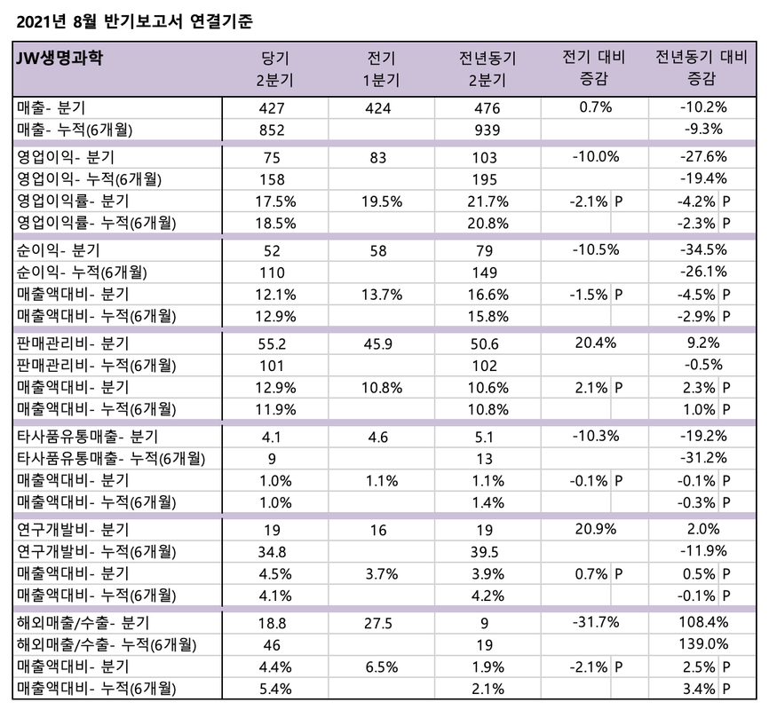 JW생명과학은 2021년 8월 반기보고서 연결기준 올 상반기 매출 852억원으로 전년동기 대비 9.3% 감소(-87억원)했다.
