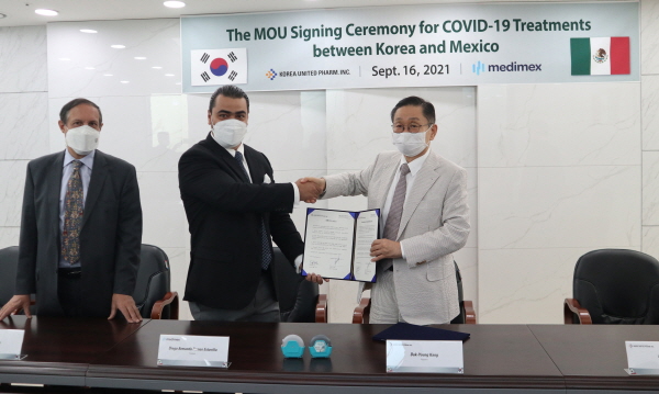 한국유나이티드제약(대표 강덕영)은 16일 오전 멕시코 메디멕스(Medimex)사와 코로나19 흡입 치료제 ‘UI030’(제품명 : 코르빈 액티베어, Corobin Activair)의 현지 공급 및 판매를 위한 상호 협력에 대한 양해각서를 체결했다.