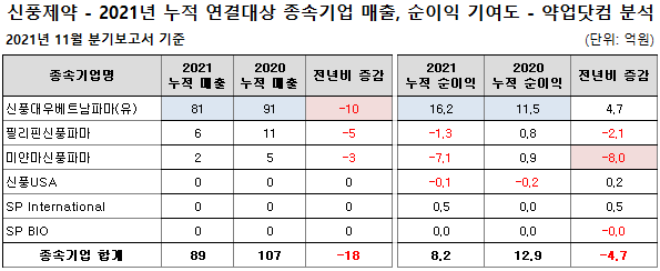 업체별 순이익을 살펴보면 신풍대우베트남파마가 16.2억원(전년동기비 4.7억원 증가), SP International이 0.5억원(전년동기비 0.5억원 증가), 신풍USA가 -0.1억원(전년동기비 0.2억원 증가), 필리핀신풍파마가 -1.3억원(전년동기비 2.1억원 감소), 미얀마신풍파마가 -7.1억원(전년동기비 8억원 감소)을 기록했다.