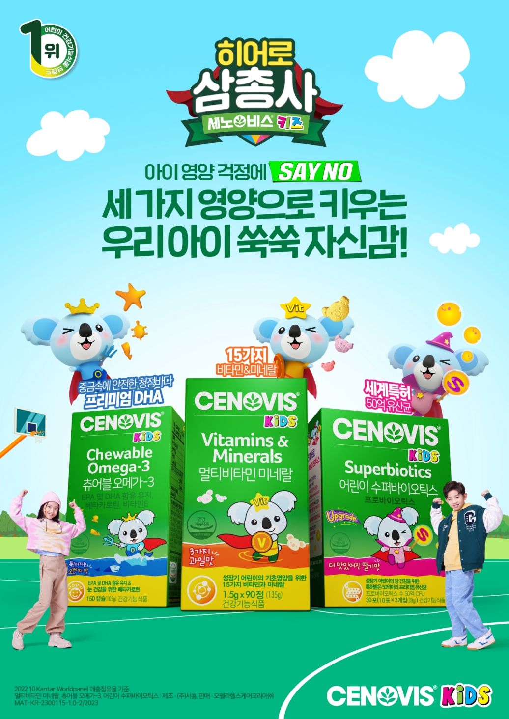 공개된 영상에는 어린이 건강 전문 브랜드로서 ‘쑥쑥 자신감’을 높인다는 캠페인 메시지를 즐겁고 새롭게 전한다. 세노비스 키즈가 추구하는 재미있고 맛있는 영양을 바탕으로 성장기 어린이의 튼튼한 기초 건강 관리에 도움을 주는 베스트 셀러 라인 ‘히어로 삼총사’ 제품 특징을 감각적이고 위트 있게 표현했다. 아이들이 히어로 삼총사를 만나고서 학교에서 마주하는 다양한 일상의 공간에서 무한 댄스를 추는 모습을 통해 건강한 아이들의 모습을 표현했다.