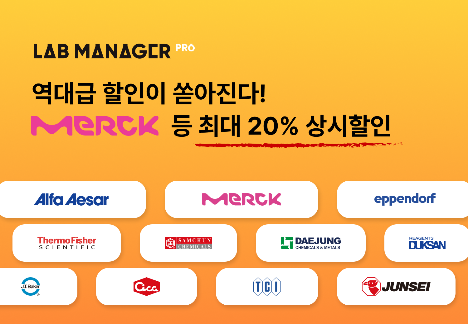연구실 시약 및 안전 관리 솔루션 랩매니저 프로(PRO)와 시약 및 연구물품 온라인 스토어 랩매니저 스토어(STORE)를 운영하는 스마트잭(대표 김건우)은 랩매니저 프로(PRO) 고객 대상 6일부터 국내외 11개 주요 시약 브랜드의 전 제품을 최대 20% 할인 가격으로 판매한다고 전했다.
