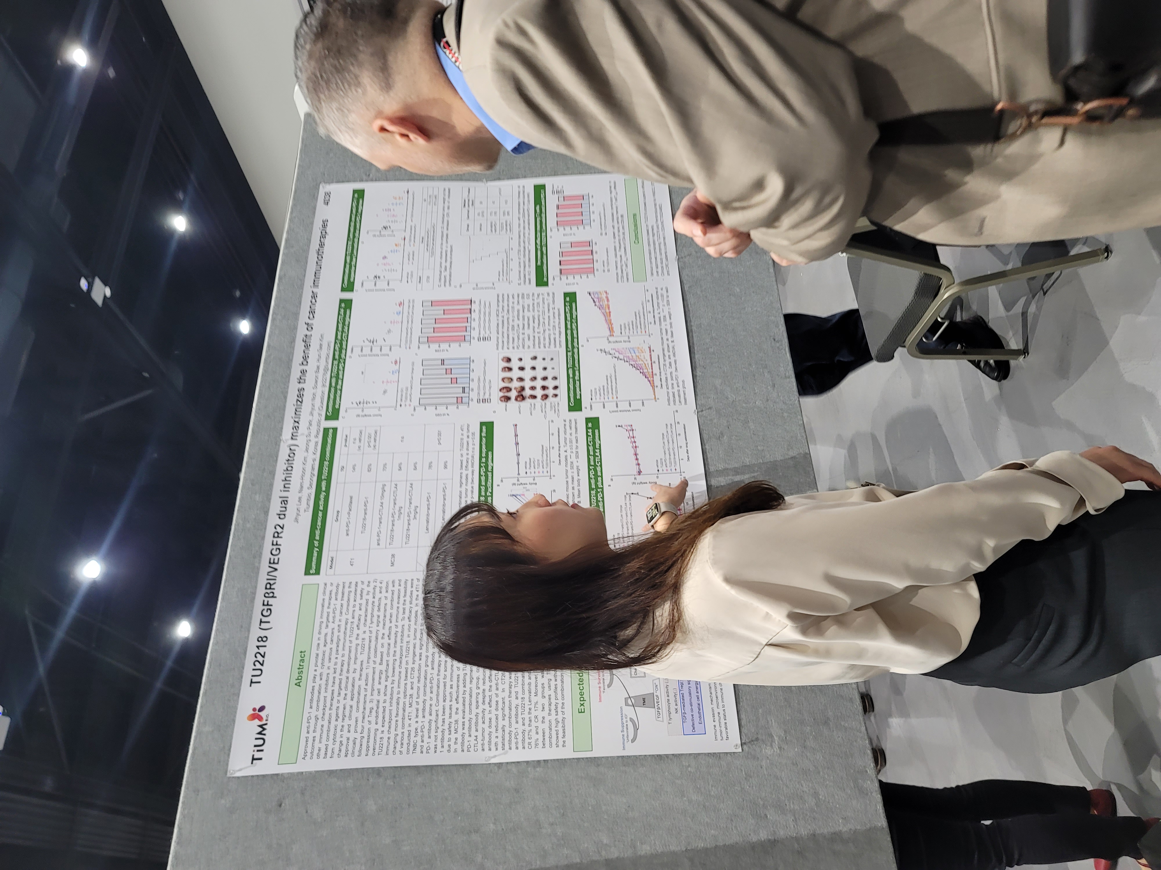 티움바이오에 따르면 AACR에서 발표된 세 가지 동물실험 중 유방암 마우스 모델(4T1)에서 TU2218과 anti-PD-1을 병용투여는 허가된 치료법(화학요법 및 anti-PD-1 병용) 대비 종양성장억제율(tumor growth inhibition, TGI)에서 통계적으로 유의미한 개선을 나타냈다. (p<0.001)
