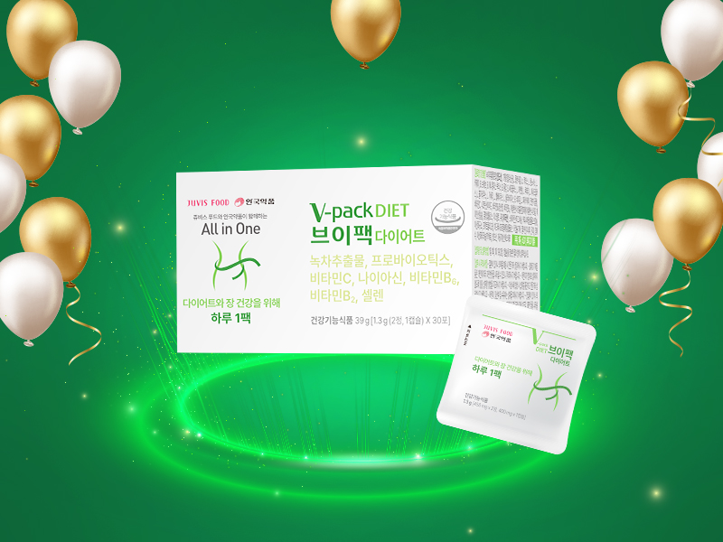브이팩 다이어트는 프로바이오틱스, 카테킨(녹차추출물), 이외 멀티비타민 및 미네랄을 함유하고 있는 제품이다. 브이팩 다이어트에 함유된 17종 프로바이오틱스는 국내산으로 영유아 유래, 모유 유래 유산균 4종을 비롯한 소장 및 대장에서 서식하는 유산균 13종을 포함하고 있어 배변 활동 원활과 장 건강에 도움을 줄 수 있다.